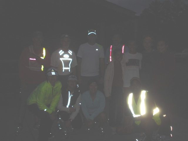 Monday, October 4 | A cold, misty night. How many days before summer?? ![]() Front L-R: Amy, Jeff, Jane. Back L-R: Heather, Joe and Howard (phasers set to stun), Dan, Marion. BTC: Annmarie and twins. On the course: Rich, Dick. ![]() After the run, L-R: Marion, Rich, Dan.