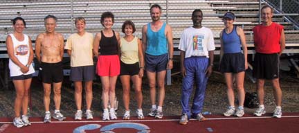 L to R: Sharon, Tony, Ali, Toby, Joanne, Sandor, Floyd, Julie, and John We ran circles around the Upper Dublin football team in tonight's workout: 400, 800, 800, and 400. |
