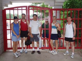 Ready to Break and Enter: Left to Right: Patty, Sandor, Dave, Dick, Jim, Coach Mike. A little bit late: Val, Steve A little bit later: the guy with the keys BTC: Karen in heels |